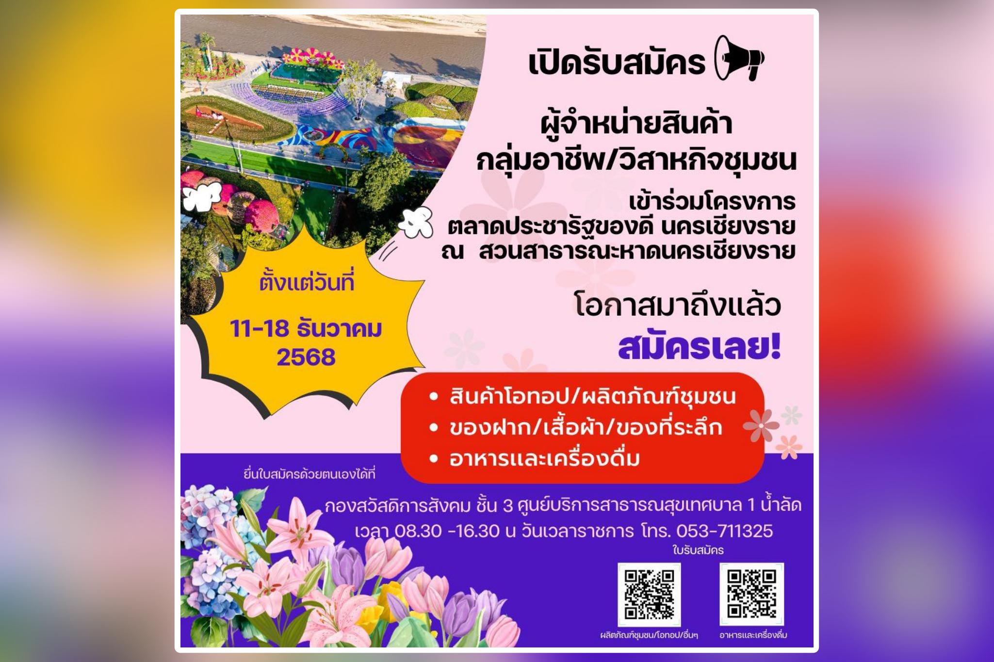เทศบาลนครเชียงราย ขอเชิญผู้ประกอบการ กลุ่มอาชีพ / วิสาหกิจชุมชน / OTOP / ผลิตภัณฑ์ชุมชน รวมถึงผู้จำหน่าย ของฝาก เสื้อผ้า ของที่ระลึก อาหาร และเครื่องดื่ม เข้าร่วมจำหน่ายในงาน “เชียงรายดอกไม้งาม” ประจำปีนี้
