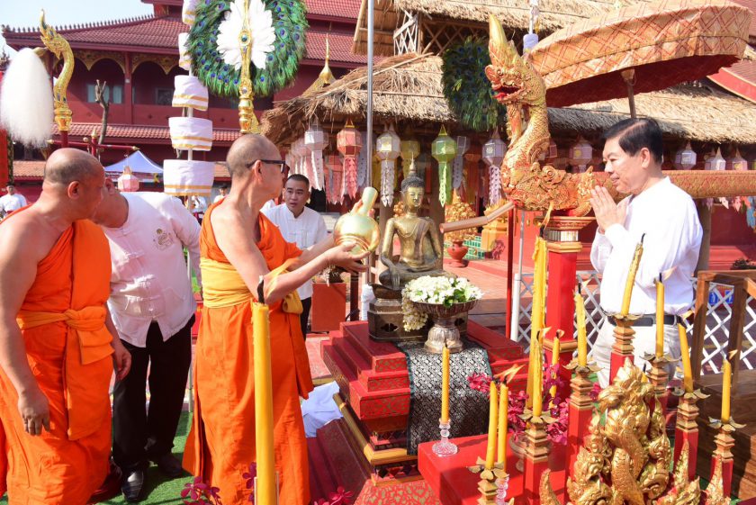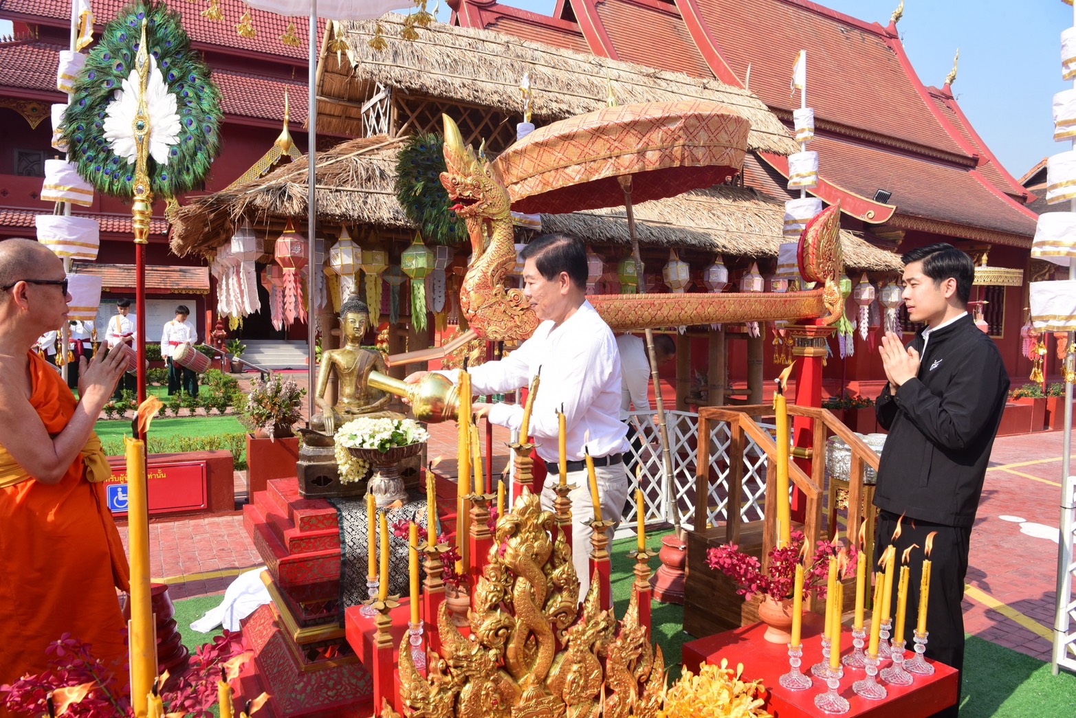 ในโอกาสนี้ ร.ต.อ.ดร.ธนรัช จงสุทธานามณี สมาชิกสภาผู้แทนราษฎรจังหวัดเชียงราย เขต 1 เป็นประธานในพิธี เพื่อนำพระเจ้าสะเปาคำ หรือพระเจ้าสำเภาทอง ซึ่งเป็นสัญลักษณ์แห่งโชคลาภ ความรุ่งเรือง และความร่มเย็นเป็นสุข ตามความเชื่อล้านนา ออกแห่ให้ประชาชนได้ร่วมสรงน้ำและสักการะ เพื่อความเป็นสิริมงคลในช่วงปีใหม่เมือง